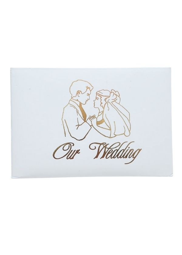 The guest book has a wonderful ivory finish with gold hot foil ‘Our Wedding’ detail and a gold tie ribbon on its closure. Inside there is room to personalise the guest book with details from the big day.